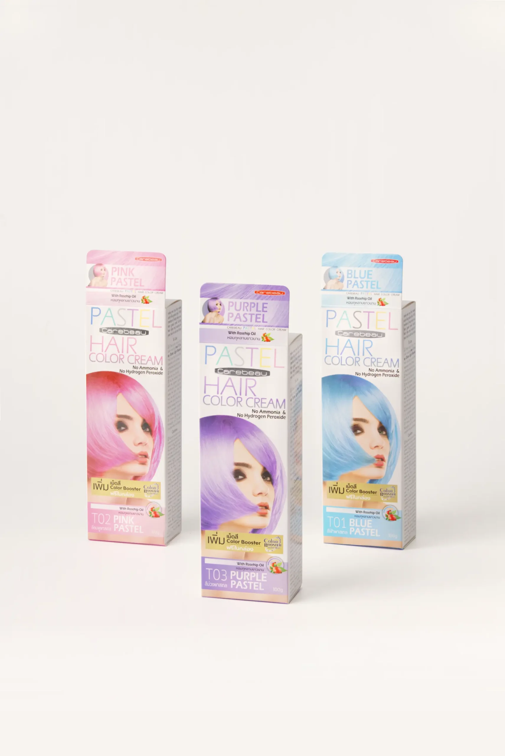 แคร์บิว พาสเทล แฮร์ คัลเลอร์ ครีม ให้สีพาสเทลที่สดใส พร้อมตัวเลือก 8 เฉดสี เช่น ฟ้า, ชมพู, ม่วง, เทา, เหลือง, เขียว, เขียวหม่น และน้ำเงินหม่น เลือกสีที่คุณชอบได้จากหน้ากล่อง ครีมนี้ไม่มีแอมโมเนียและไฮโดรเจนเปอร์ออกไซด์ ทำให้มีกลิ่นหอมและไม่ทำให้ผมแข็งกระด้าง ส่วนผสมของโรสฮิปออยล์ ช่วยบำรุงให้ผมนุ่มและเงางาม ขณะเดียวกันก็ให้สีพาสเทลที่สวยงาม